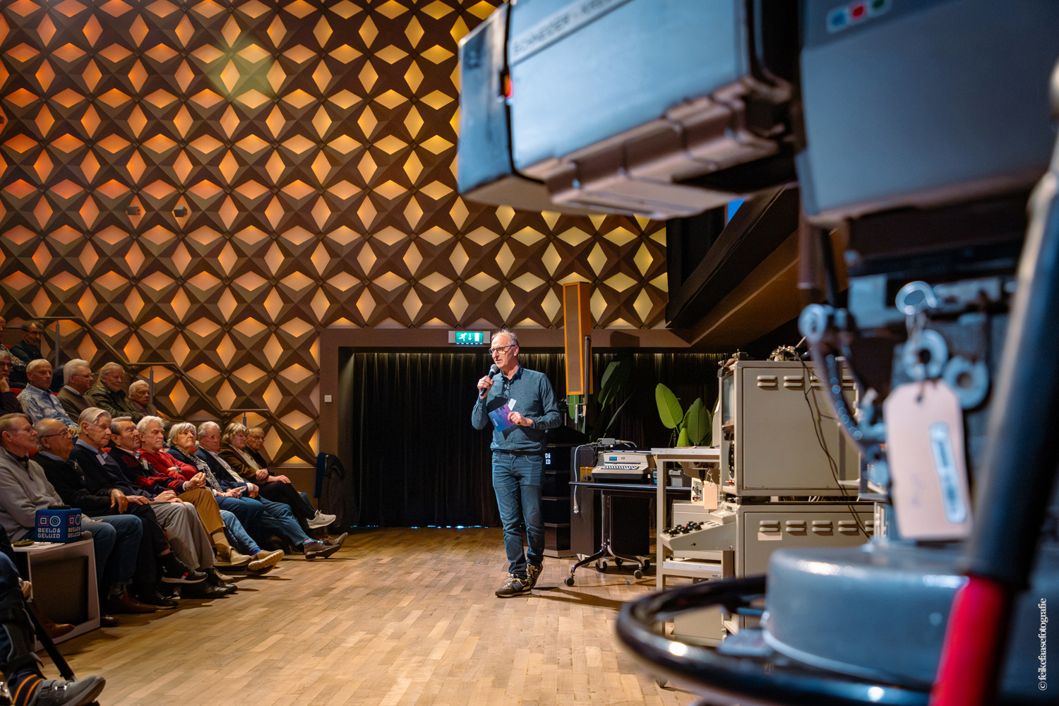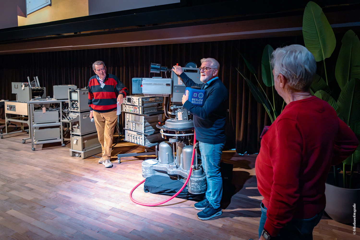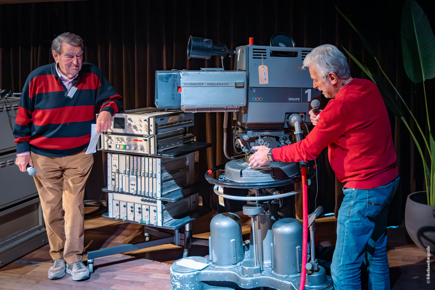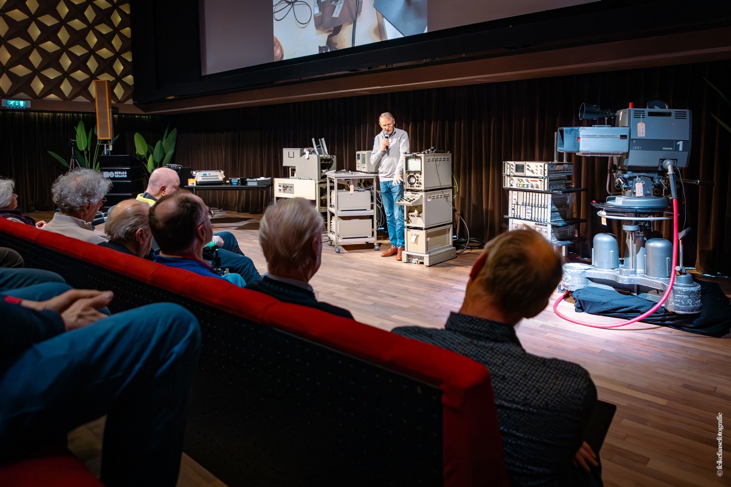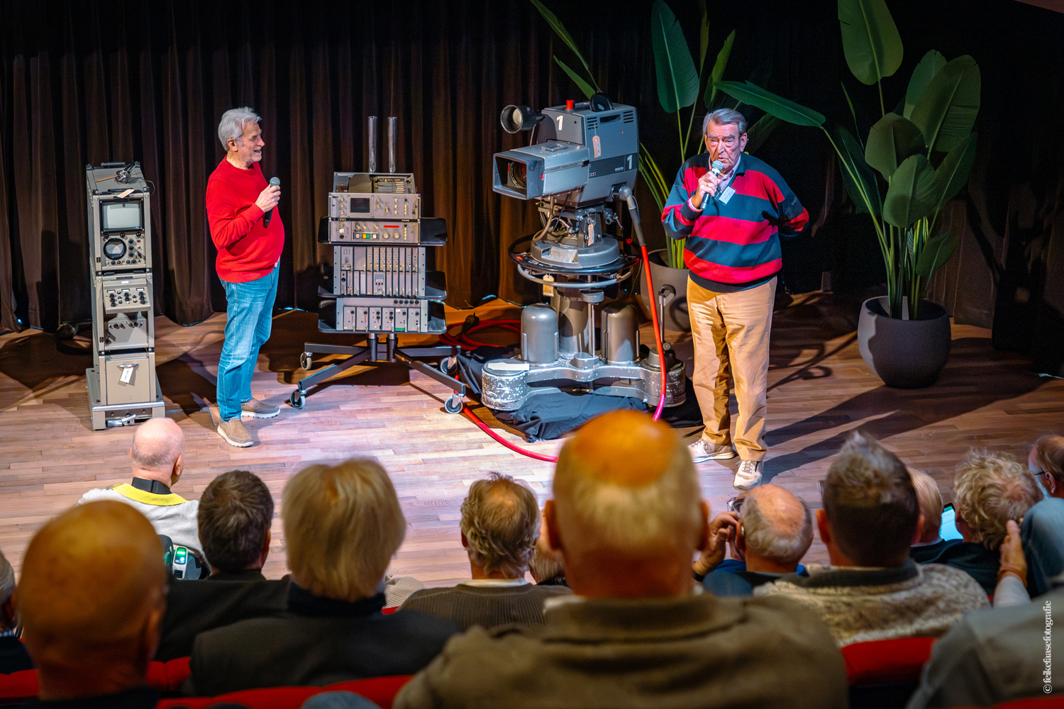 Ben Rekker was het eerst aan de beurt en vertelde interessante zaken over de bedienpositie van de shaders in de zwart-wit tijd. Hierna liet Carel Sarton zijn licht schijnen over de sico kast, die voor commentatoren werd gebruikt; de Universeel plug en de luidsprekerzuil, zoals die voorheen bij televisie opnamen en uitzendingen gebruikt werd om het geluid uit te versterken.
