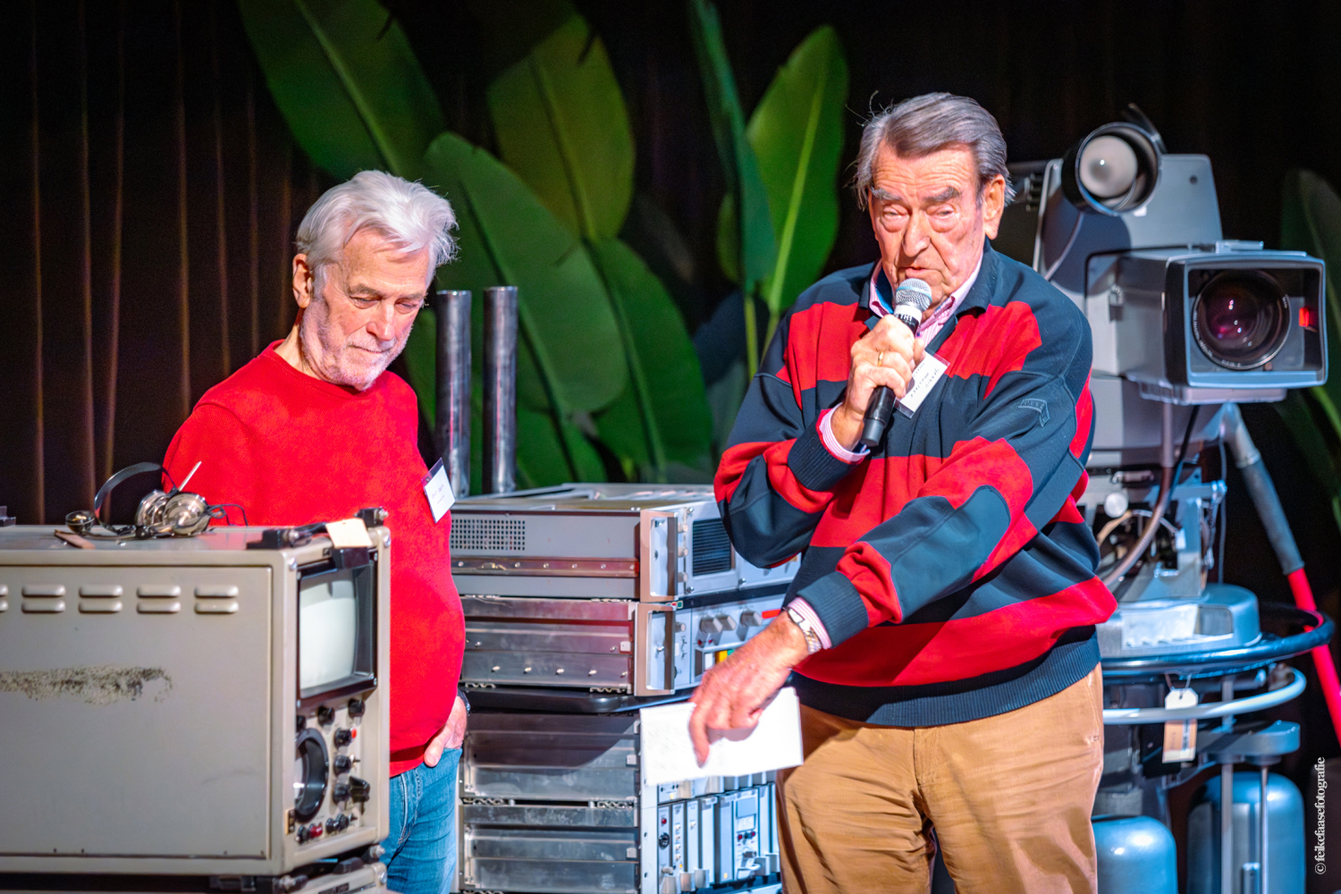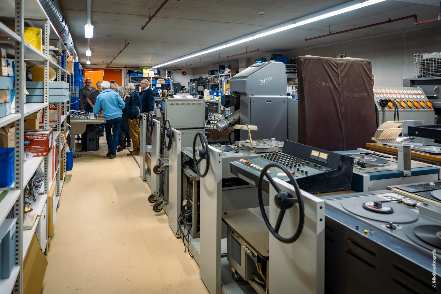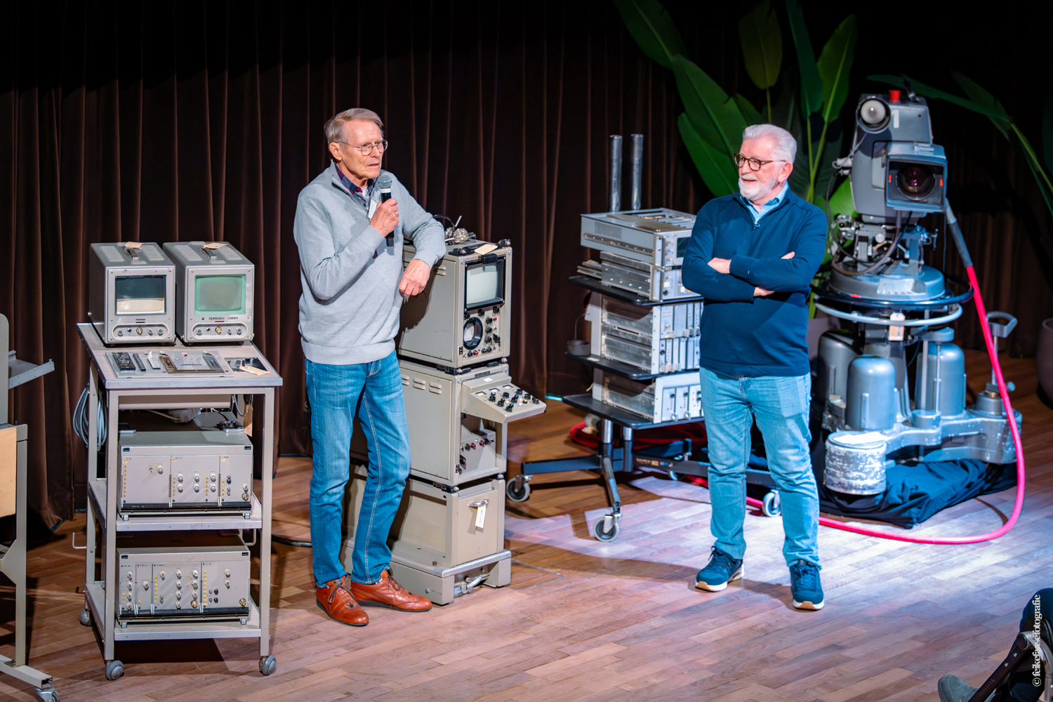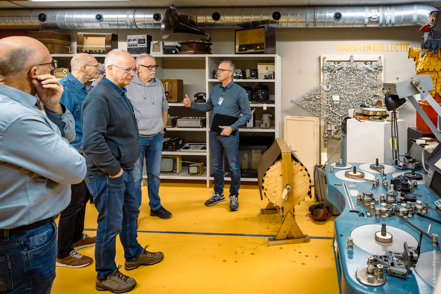 Ben Rekker was het eerst aan de beurt en vertelde interessante zaken over de bedienpositie van de shaders in de zwart-wit tijd. Hierna liet Carel Sarton zijn licht schijnen over de sico kast, die voor commentatoren werd gebruikt; de Universeel plug en de luidsprekerzuil, zoals die voorheen bij televisie opnamen en uitzendingen gebruikt werd om het geluid uit te versterken.